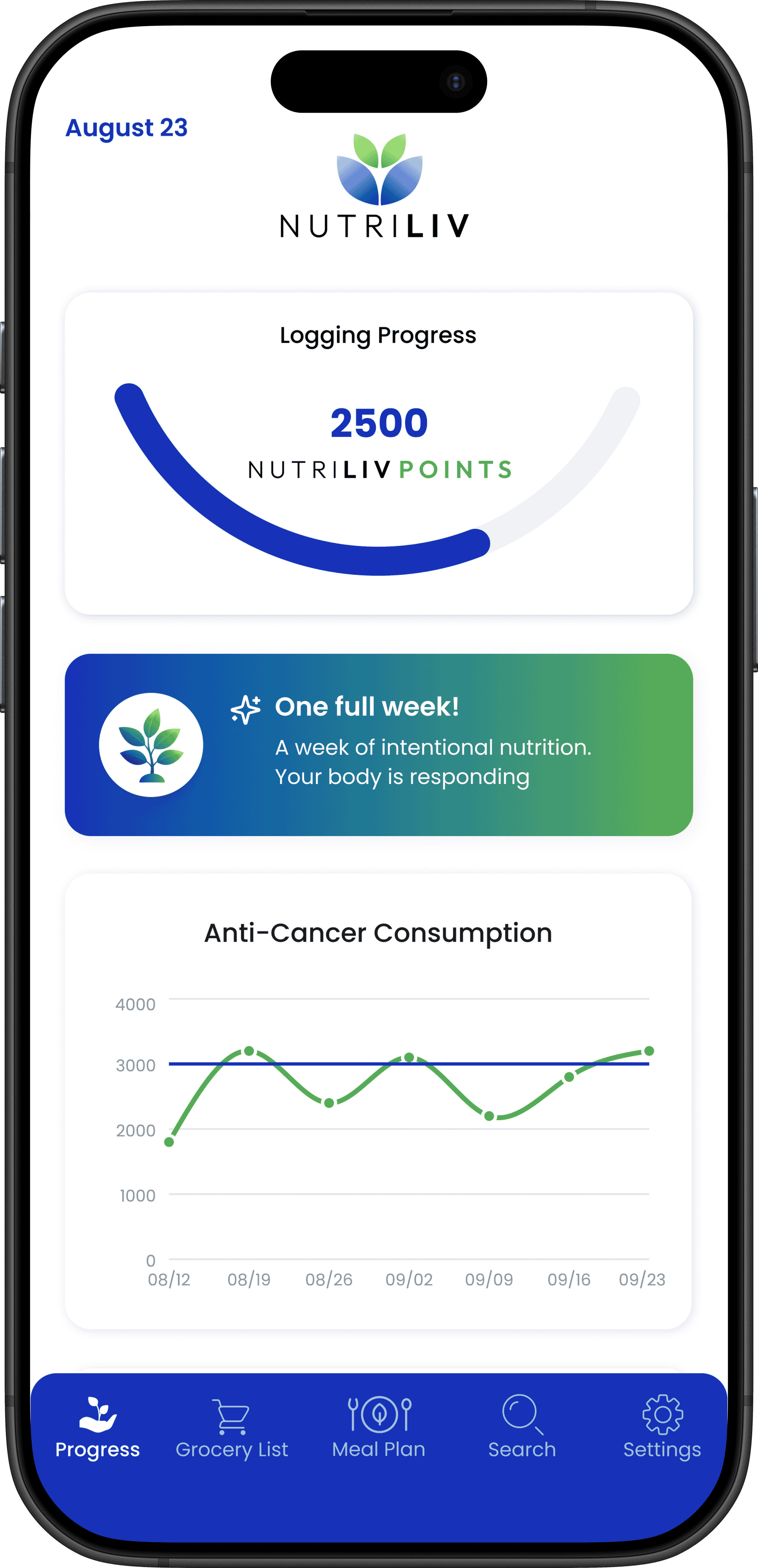 Every recipe in NutriLiv has a NutriPoints value calculated from the combined anticancer evidence of all its ingredients. When you log meals, the app tracks your daily and historical NutriPoints, plus a breakdown of the specific anticancer capabilities you're consuming. See your progress over days, weeks, and months. Not guesswork. Data.